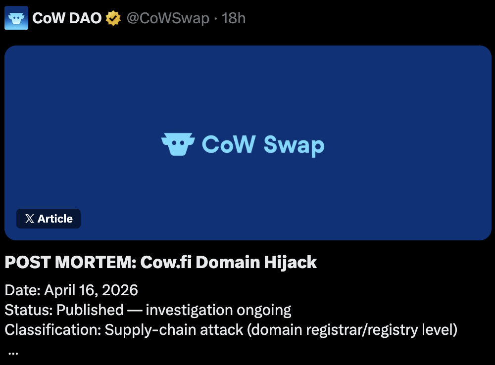 CoW DAO X Article: POST MORTEM — Cow.fi Domain Hijack. Date April 16, 2026. Status: Published — investigation ongoing. Classification: Supply-chain attack (domain registrar/registry level).